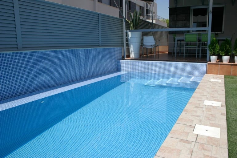 El gresite monocolor en azul claro tiene un espesor de 4 mm y juntas de 2 mm, garantizando una instalación duradera y resistente. La destonificación controlada asegura una apariencia uniforme y atractiva.