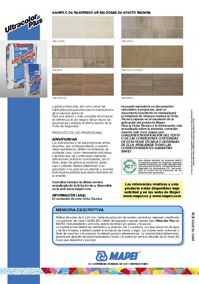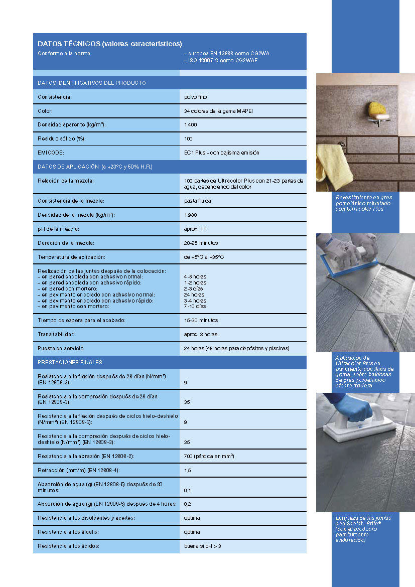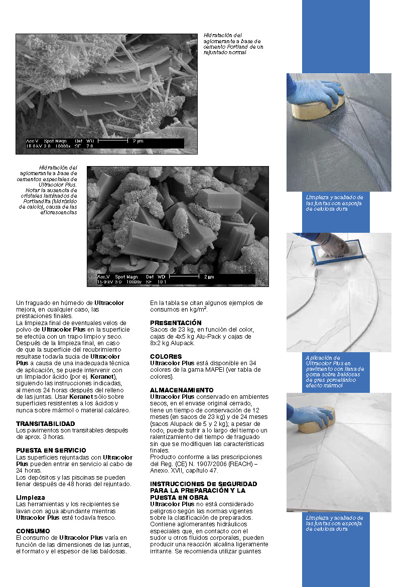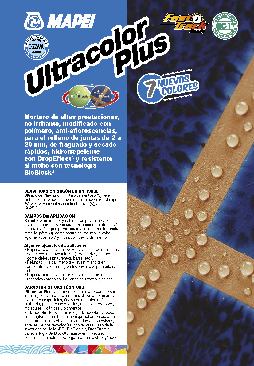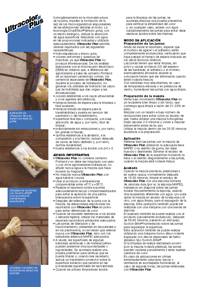 Ultracolor Plus es un mortero formulado para no ser irritante, constituido por una mezcla de aglomerantes hidráulicos especiales, áridos de granulometría calibrada, polímeros especiales, aditivos hidrófobos, moléculas orgánicas y pigmentos. En Ultracolor Plus, la tecnología Ultracolor se basa en un aglomerante hidráulico especial autohidratante que garantiza la perfecta uniformidad de los colores, a través de dos tecnologías innovadoras, fruto de la investigación de MAPEI: BioBlock® y DropEffect®. La tecnología BioBlock® consiste en moléculas especiales de naturaleza orgánica que, distribuyéndose homogéneamente en la microestructura de la junta, impiden la formación de la raíz de los microorganismos responsables de las alteraciones debidas al moho. La tecnología DropEffect® (efecto gota), con un efecto sinérgico, reduce la absorción de agua superficial. Mezclado con agua en las proporciones indicadas y utilizado adecuadamente, Ultracolor Plus permite obtener rejuntados con las siguientes características: • hidrorrepelencia y efecto gota; • colores uniformes y ausencia de manchas, ya que Ultracolor Plus no produce eflorescencias. De los análisis elaborados con el microscopio electrónico (SEM) se observa que, a diferencia del aglomerante a base de cemento Portland de un rejuntado cementoso común, los cementos especiales de Ultracolor Plus, durante el proceso de hidratación, no generan los cristales de hidróxido de calcio (cal de hidrólisis) que dan origen a las eflorescencias;