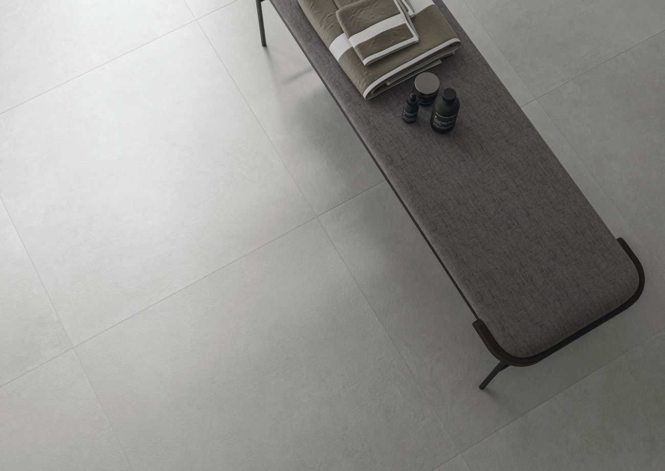 El pavimento porcelánico está disponible en formato 75×75 cm y también en el formato 60×120 cm, ambos con un acabado mate que resalta la suavidad de los tonos Ivory, Pearl y White, ideales para crear superficies continuas y equilibradas en cualquier habitación. Estos colores neutros y versátiles permiten integrarse fácilmente en estilos decorativos variados, desde los más clásicos hasta los más modernos.