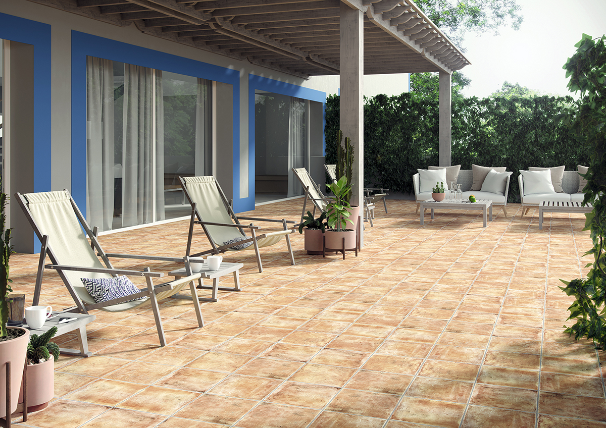 Gres espesorado antideslizante es un azulejo de gres de pasta roja espesorado tipo rústico con acabado antideslizante disponible en formato 33.3×33.3 y en color Terra.