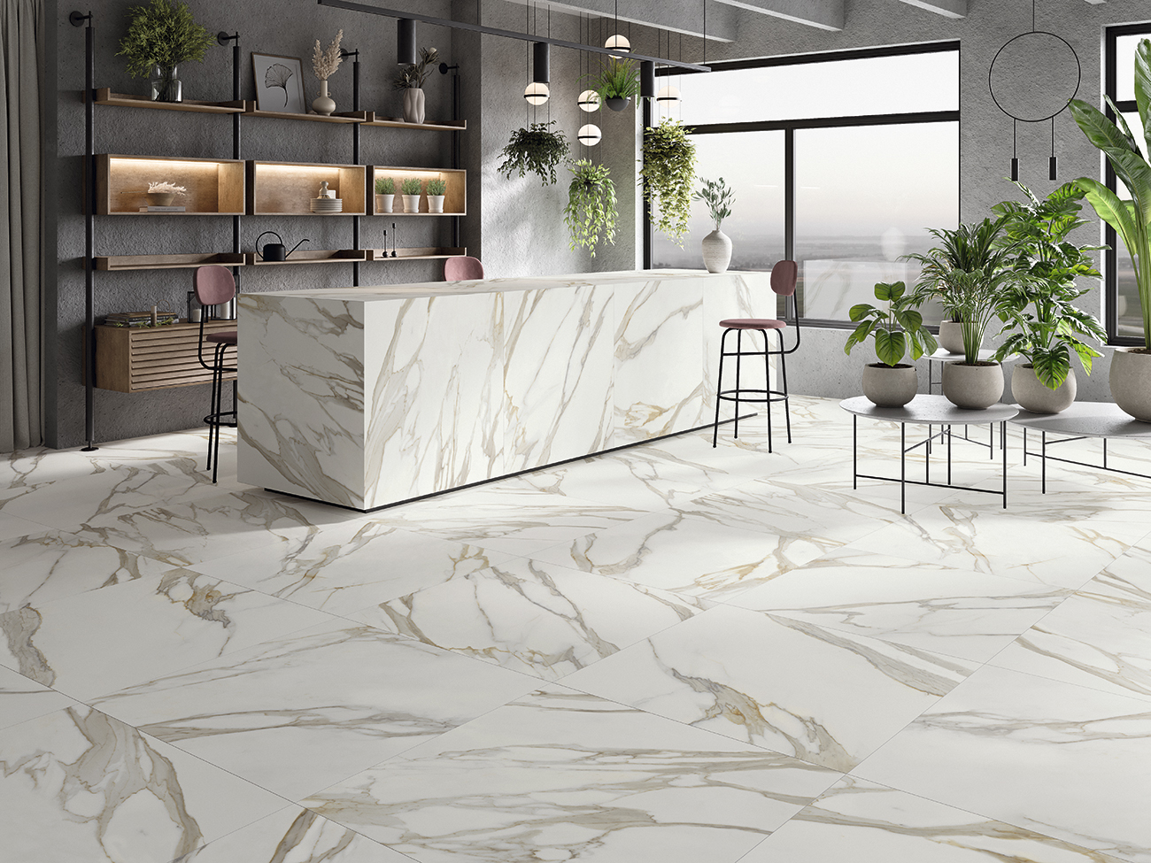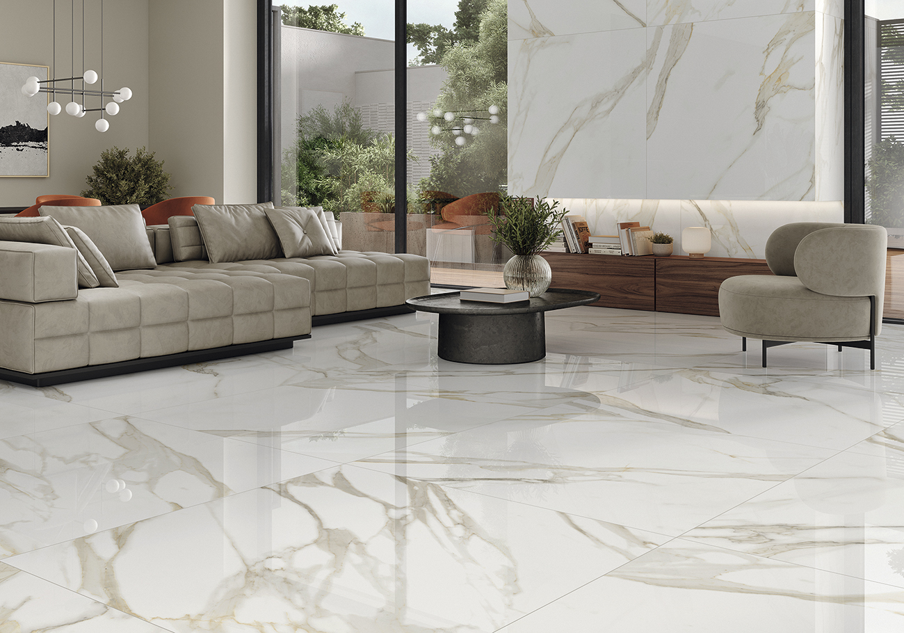La serie ofrece una amplia variedad de formatos y acabados para adaptarse a diferentes estilos decorativos. Los formatos 120×120 cm y 60×120 cm están disponibles en un acabado pulido rectificado, que destaca por su brillo intenso y la profundidad de sus vetas, creando una atmósfera luminosa y elegante en cualquier espacio. Por otro lado, los formatos 100×100 cm y 60×120 cm presentan un acabado satinado rectificado, ideal para quienes buscan un aspecto más suave y mate, sin renunciar a la sofisticación del mármol.