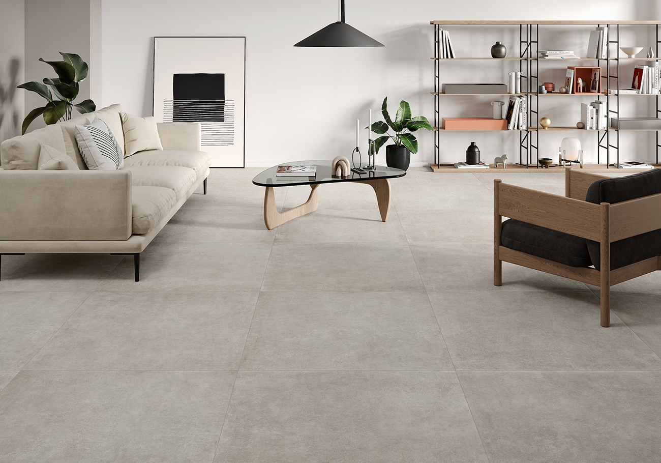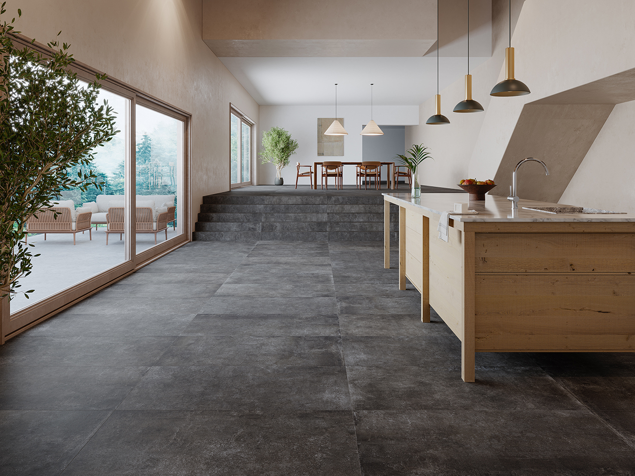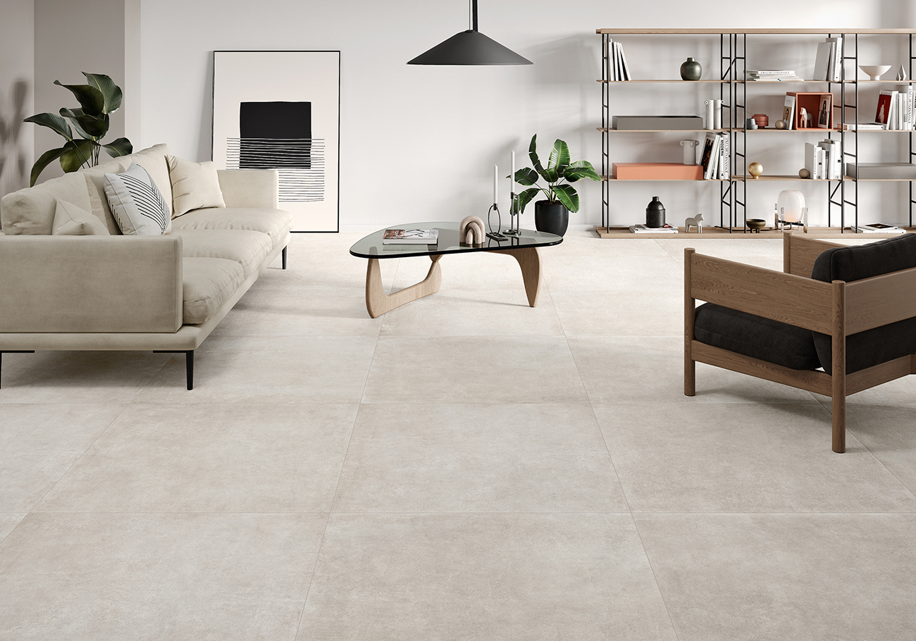 Pavimento disponible en varios formatos y colores. También incluye un revestimiento como decorado en pasta porcelánica.