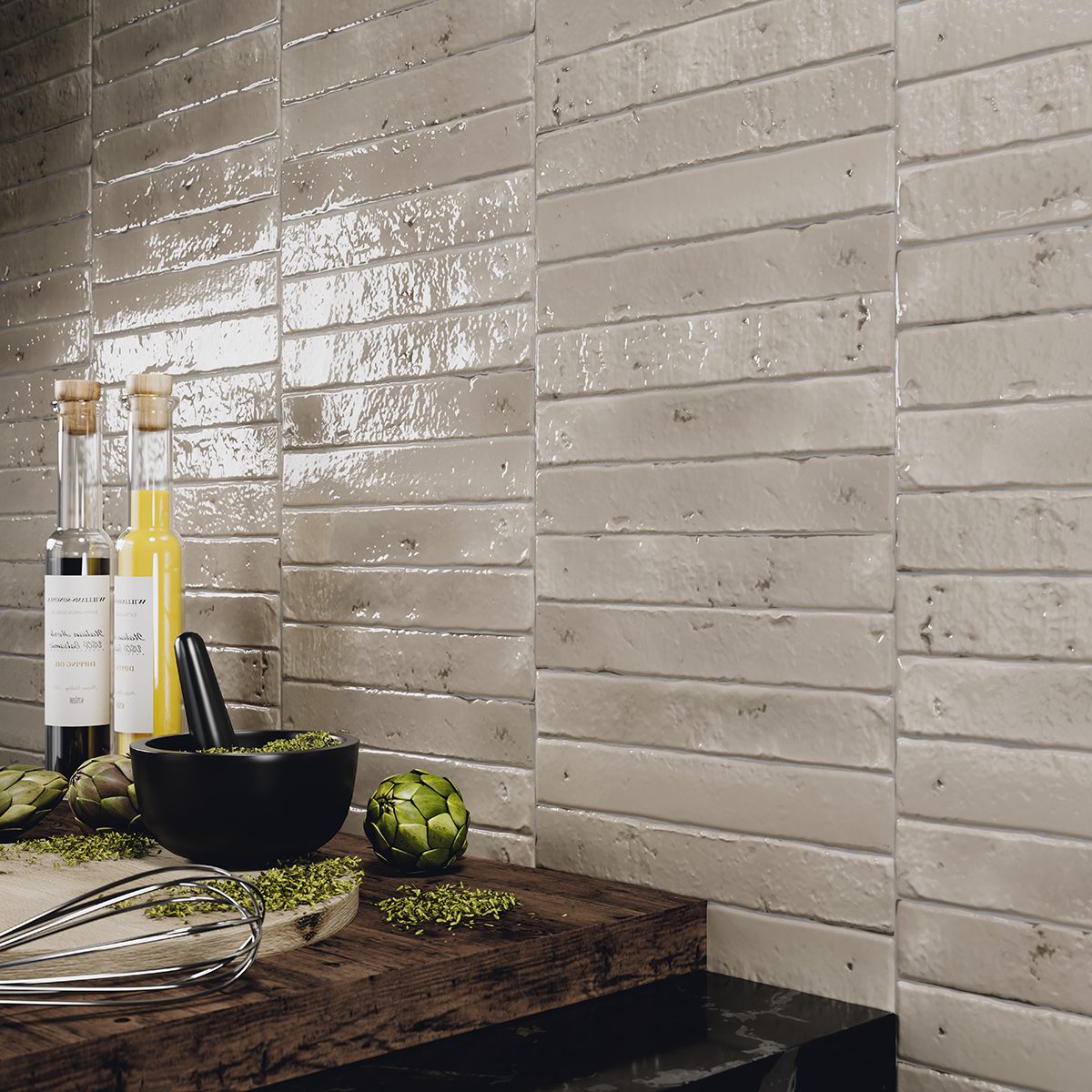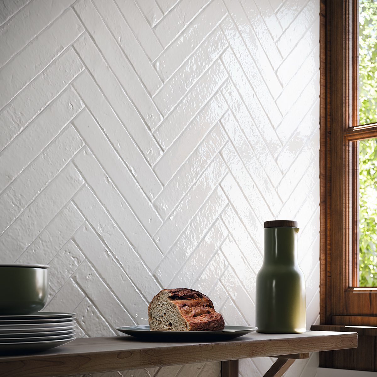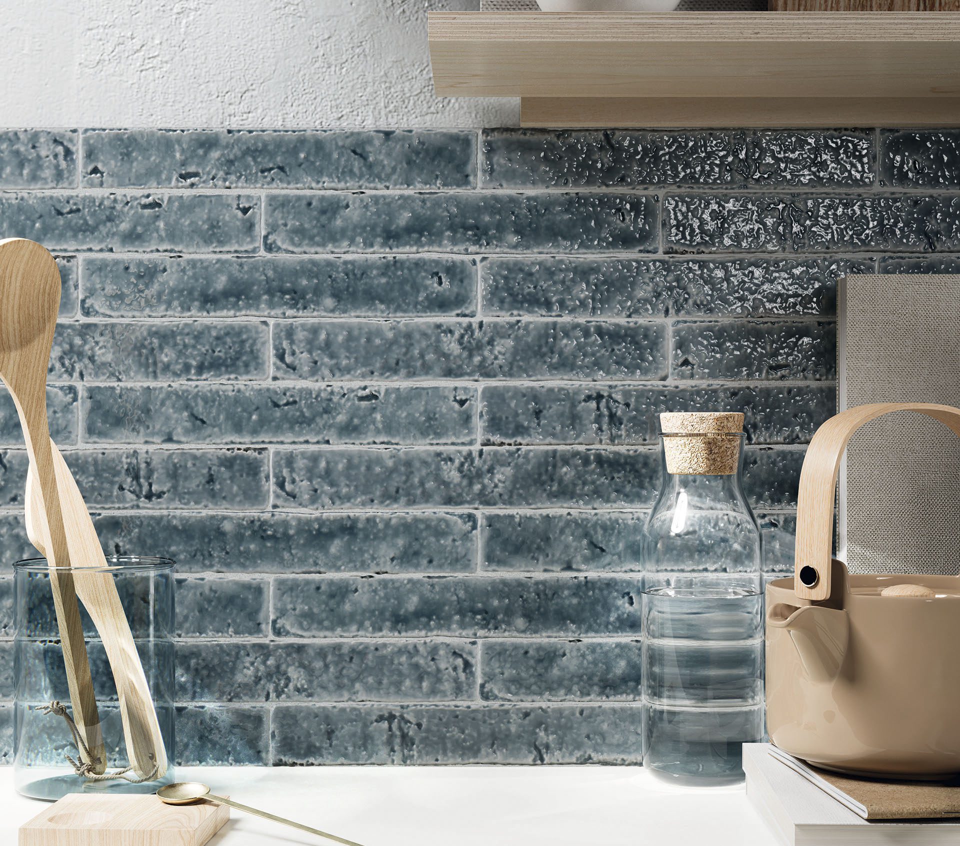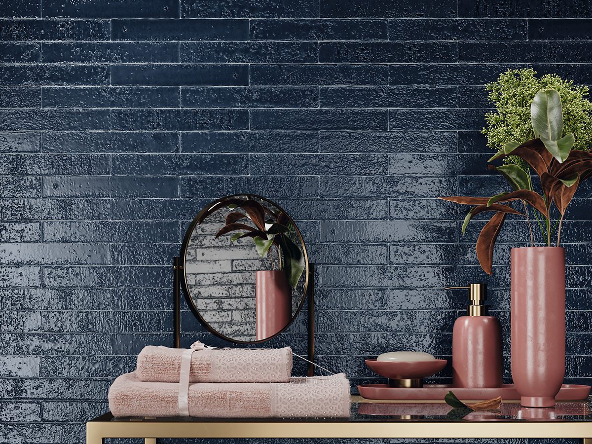 Azulejo de efecto Zellige en formato 3,8×23,5 cm de estilo wabi-sabi Cada color presenta nueve superficies diferentes, de aspecto muy irregular y desgastado, que crean un intencionado contraste de tonos y relieve entre las piezas. Hay veintiún colores diferentes en tres tipos de acabado: brillo, mate y craquelado. Descubra la belleza de la imperfección.