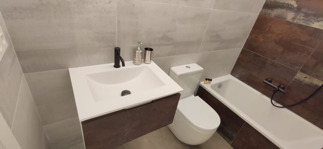 Fue un gran descubrimiento lo del azulejo rectificado, porque no queríamos que se vieran las juntas con este efecto metalizado, la pared ha quedado muy bien y todo el proceso de compra ha sido muy fácil con ellos.