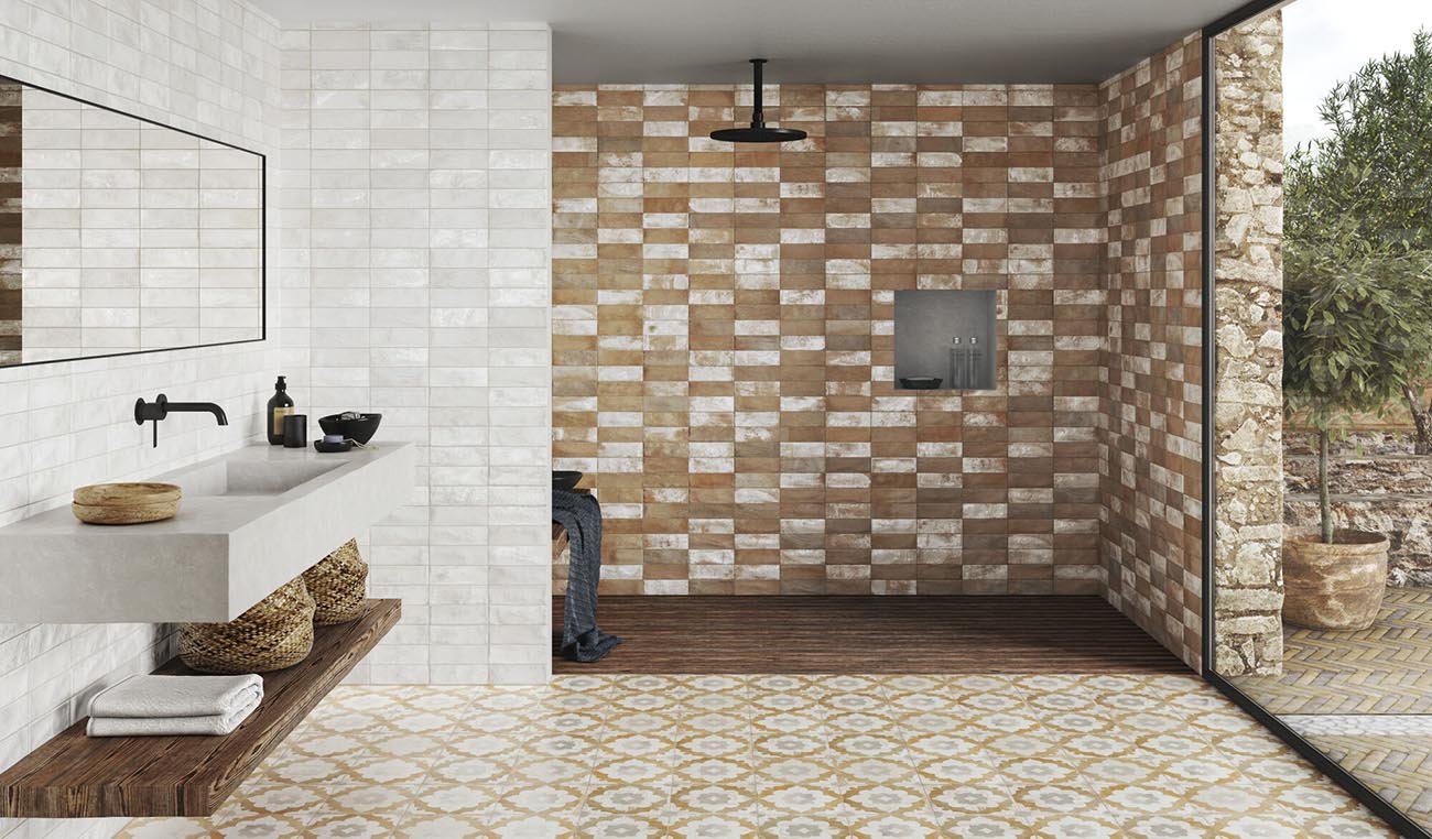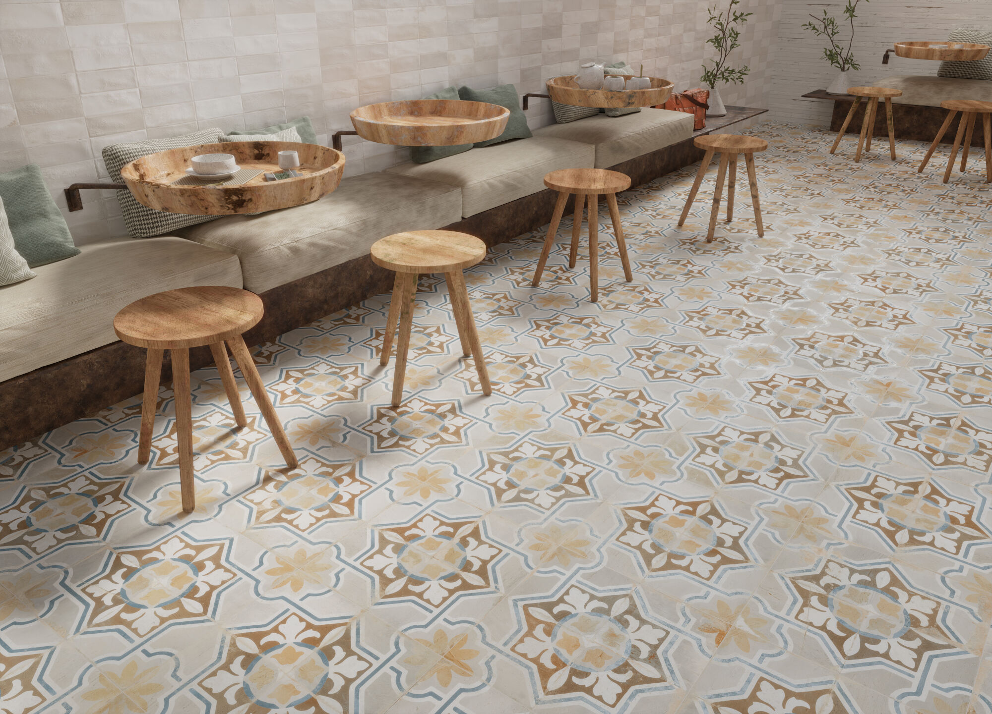 Las otras dos opciones de la colección se inspiran en estilos hidráulicos, con motivos florales y una estética que promueve espacios cálidos y serenos. Estos diseños son ideales para proyectos que abrazan la tendencia wabi-sabi, que valora la belleza de la imperfección y la autenticidad. Los patrones y colores suaves de estos modelos hidráulicos ofrecen una sensación de paz y tranquilidad, perfecta para espacios que buscan un refugio del ajetreo diario.