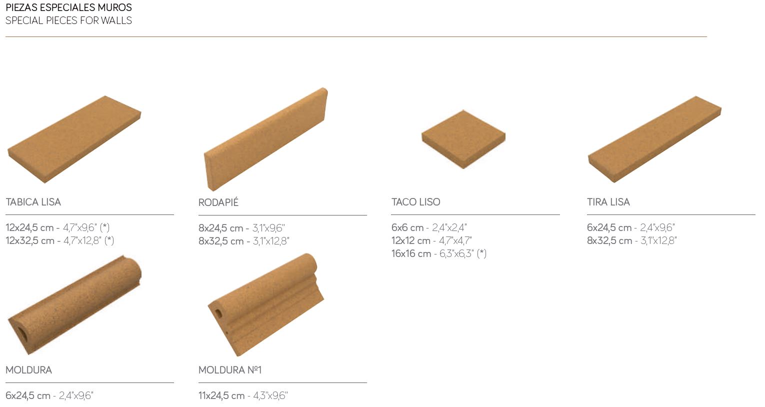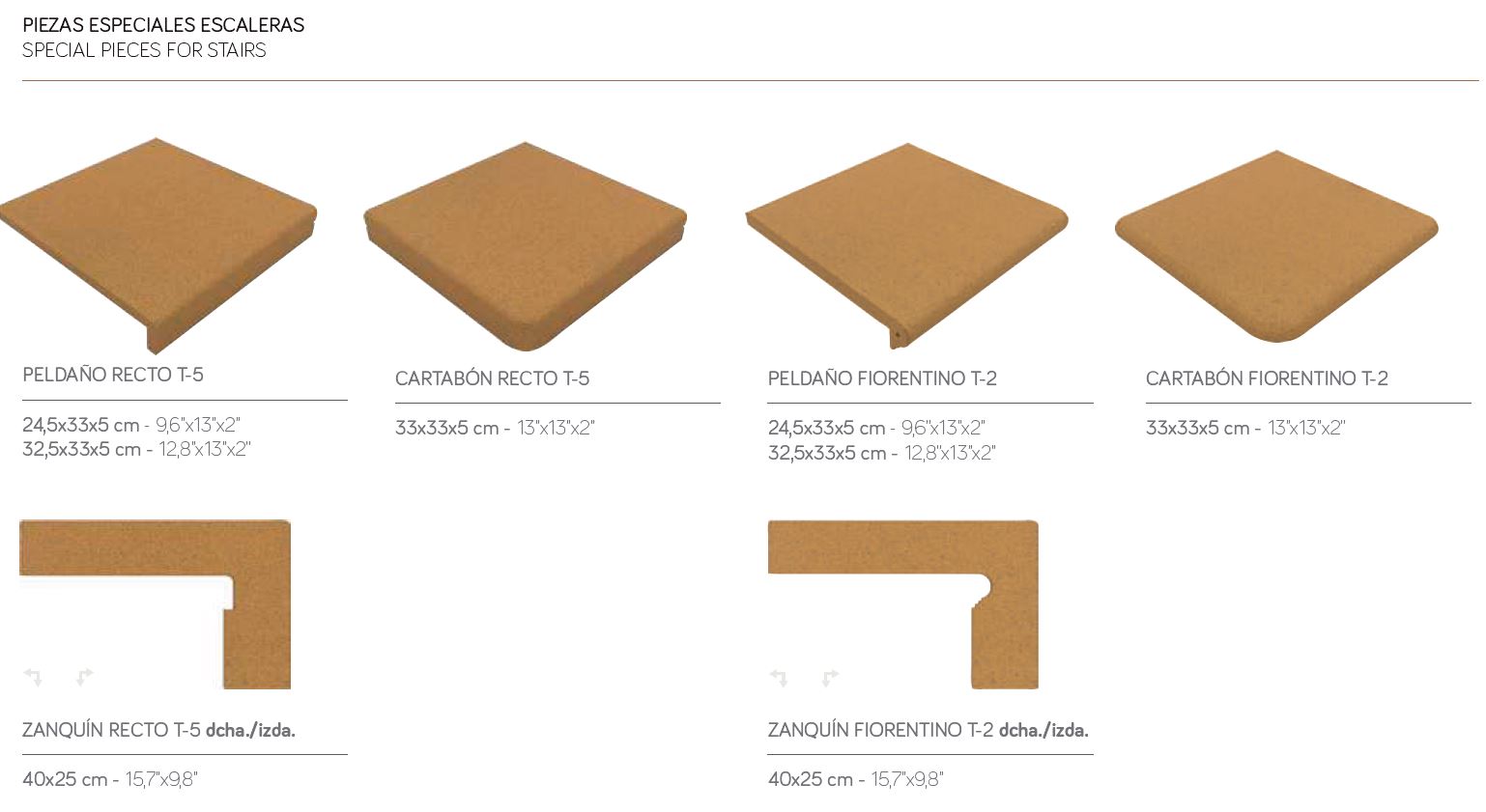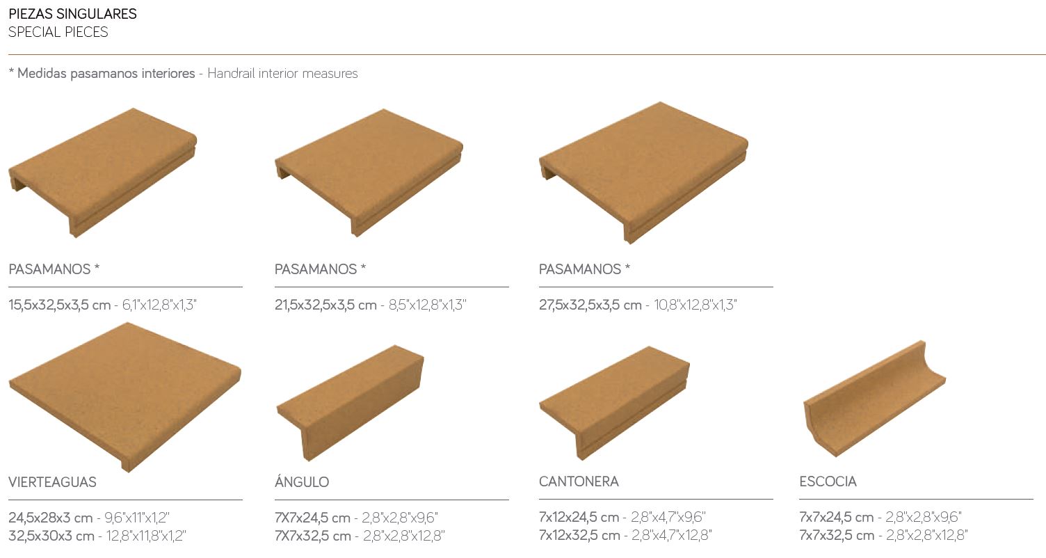 | Tipo de Pieza | Cantonera 7x12x24.5 cm, Cantonera 7x12x32.5 cm, Cartabon Fiorentino 33x33x5 cm, Cartabon recto 33x33x5 cm, Escocia 7x7x24.5 cm, Escocia 7x7x32.5 cm, Esquina Exterior 16×16 cm, Esquina Interior 20×20 cm, Moldura 6×24.5 cm, Pasamanos 15.5×32.5×3.5 cm, Pasamanos 21.5×32.5×3.5 cm, Pasamanos 27.5×32.5×3.5 cm, Peldaño Fiorentino 24.5x33x5 cm, Peldaño Fiorentino 32.5x33x5 cm, Peldaño recto 24.5x33x5 cm, Peldaño recto 32.5×32.5×5 cm, Rodapié 8×24.5 cm, Rodapié 8×32.5 cm, Tabica Lisa 12×24.5 cm, Tabica Lisa 12×32.5 cm, Tira Lisa 6×24.5 cm, Tira Lisa 8×32.5 cm, Viertaguas 24.5x28x3 cm, Viertaguas 32.5x30x3 cm |