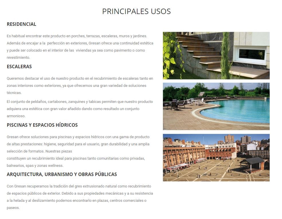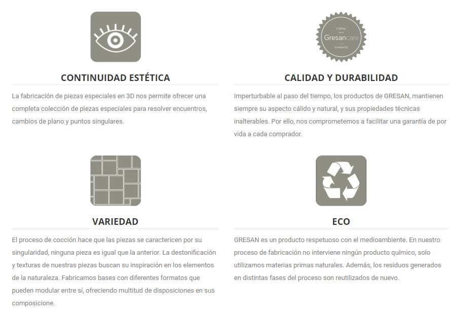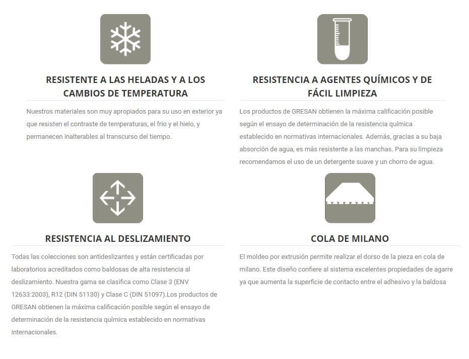 30,51 € - 40,35 €Rango de precios: desde 30,51 € hasta 40,35 € / m2 (IVA Incluido)La Serie GRESAN es un azulejo de Gres extruido antideslizante. Es una serie de Extrusión Natural optima para exteriores y zona públicas. De fácil mantenimiento y perdurabilidad. Excelentes características técnicas fruto de un elaborado sistema productivo. Formatos y colores disponibles:
