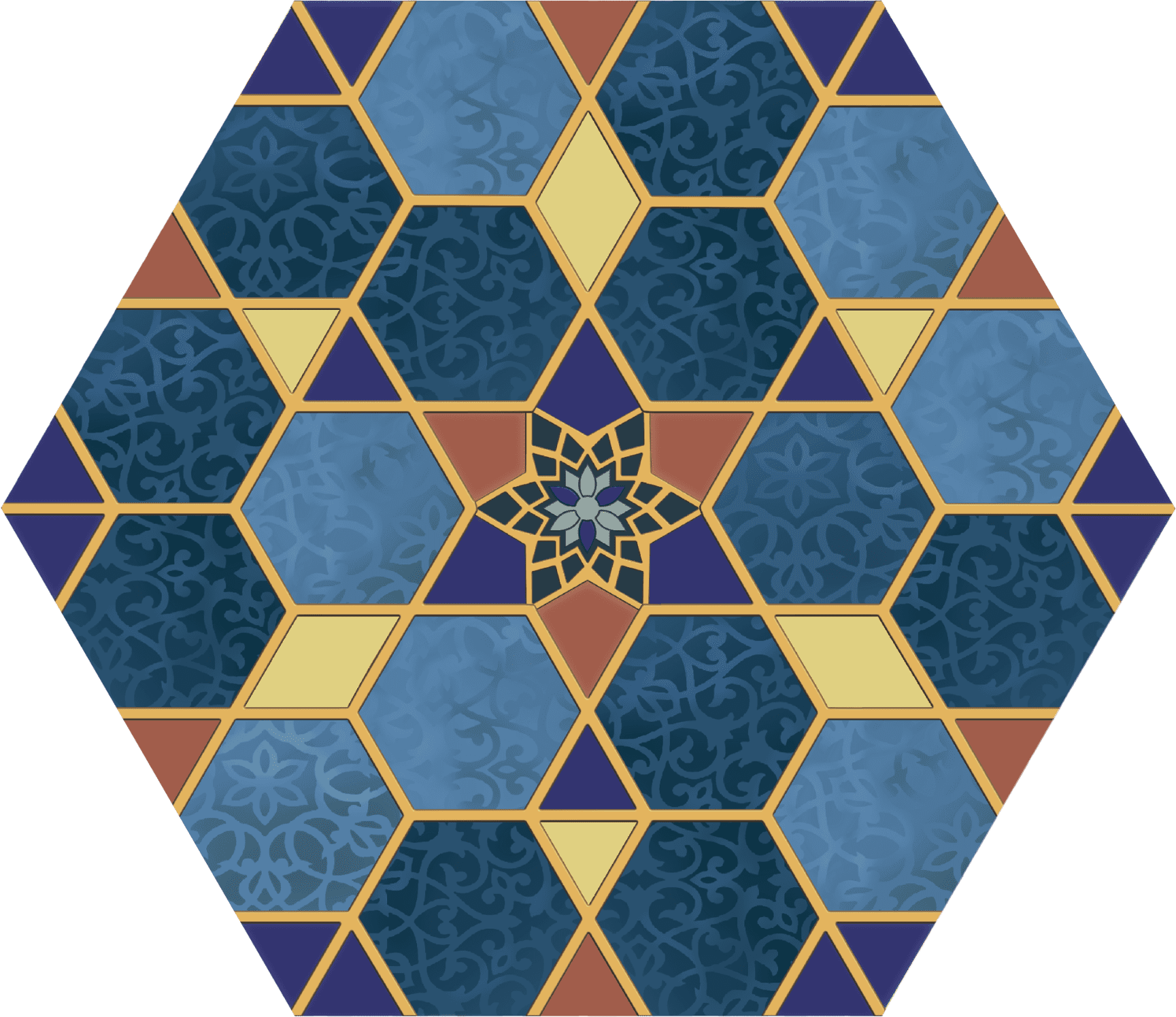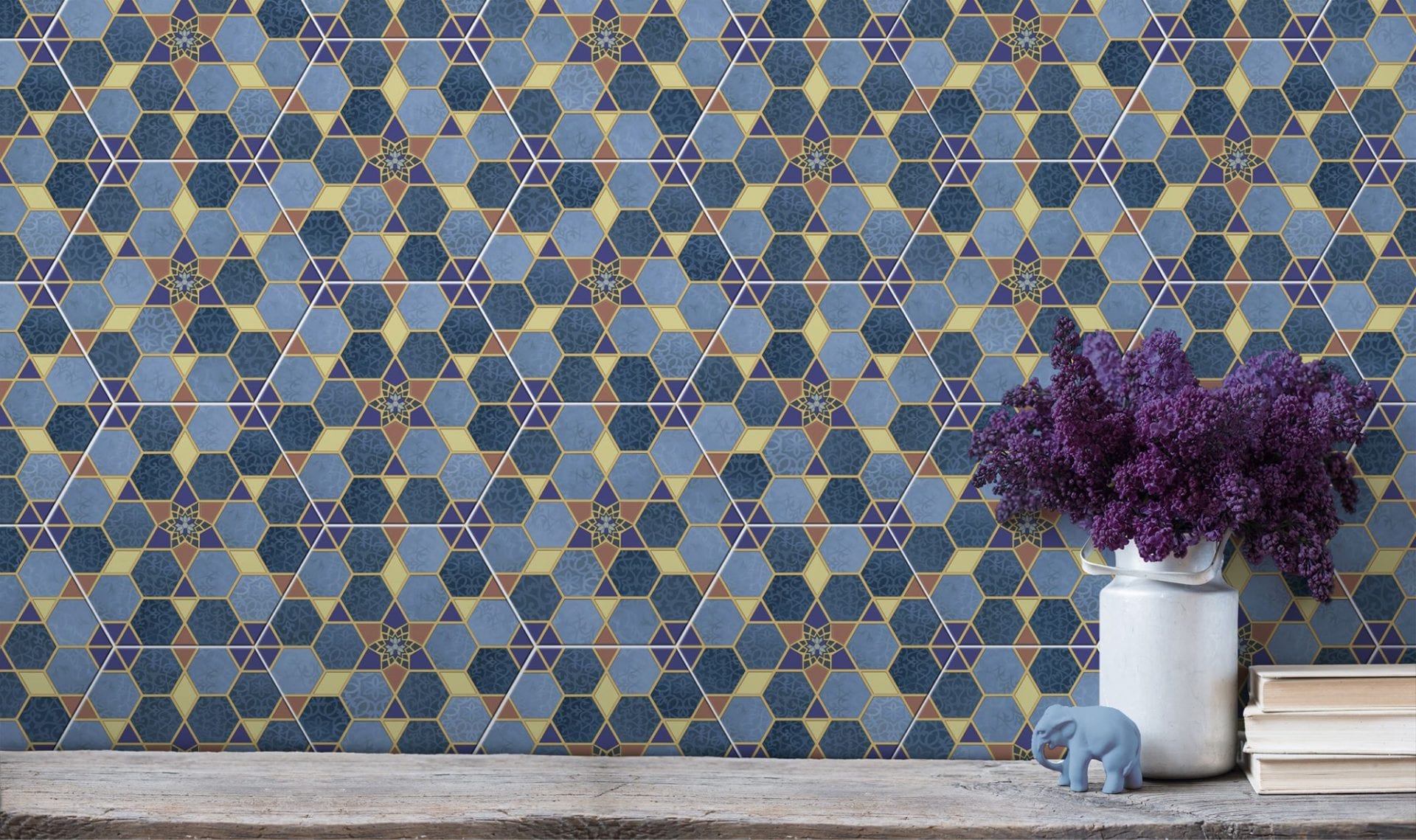 Serie KHALAL . Azulejo porcelánico tipo hidráulico en formato 22×25 hexagonal, presenta un acabado mate.