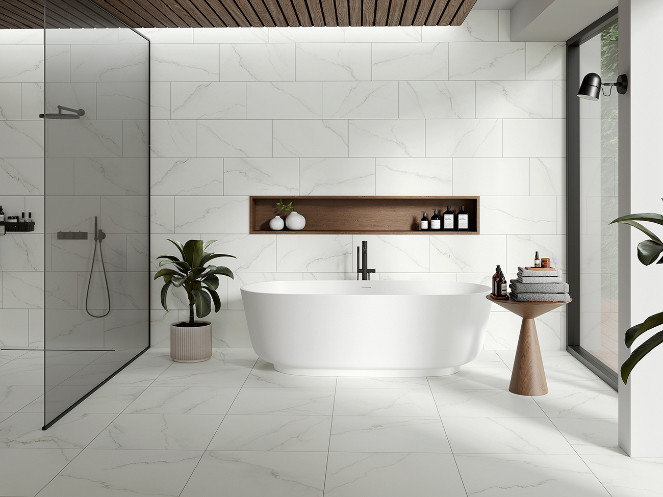 El formato 60×120 cm está disponible en acabado pulido rectificado, lo que proporciona un brillo profundo y resalta las vetas naturales del mármol, creando una atmósfera luminosa y refinada. Este acabado es ideal para quienes buscan un diseño más llamativo y de alto impacto visual.