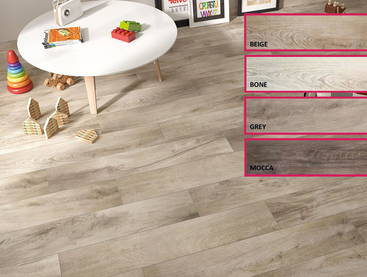 La Serie Myrcella es un azulejo imitación madera disponible en porcelánico en formato 23×120, rectificado, y en gres de pasta roja en formato 20,5×61,5. Presenta un acabado mate en todos sus colores: Beige, Bone, Mocca, Grey. Perfecto para la colocación en suelos de interior.