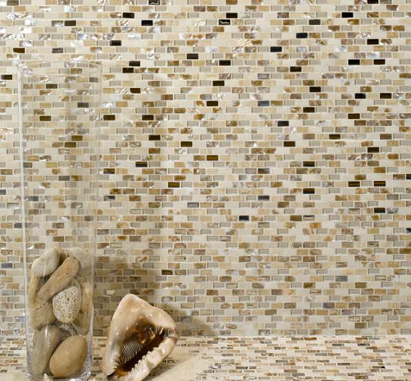 La Serie NACAR es un azulejo realizado con vidrio, piedra, mármol y nácar estilo mosaico, que se presenta en acabado brillo con mate, con formato 30×30. Está pensado para revestimientos de interiores.