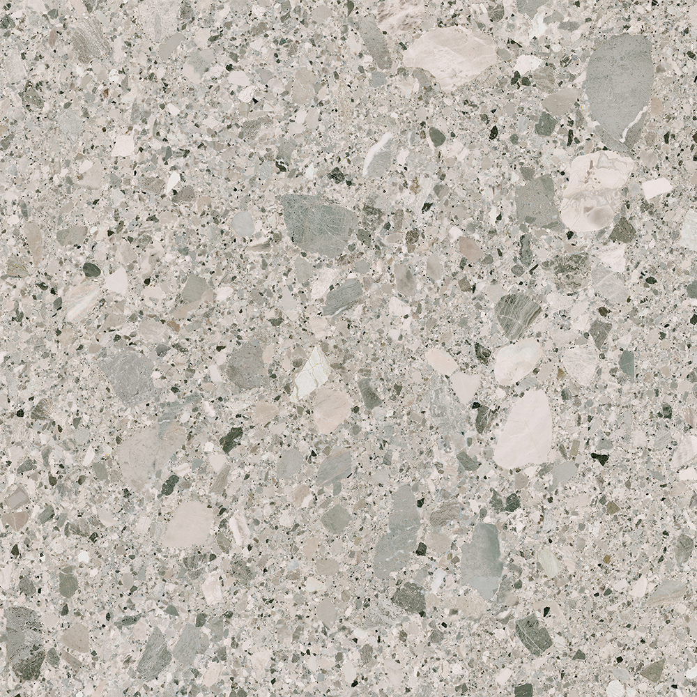 El efecto piedra de la serie Pietra Di Gre se caracteriza por su rica textura y su mezcla de fragmentos de diferentes tamaños y colores. Esta cerámica imitación piedra recrea la apariencia del terrazo original, aportando un toque de sofisticación y elegancia a cualquier ambiente. La moderada variación de tono (V3) entre las piezas contribuye a la naturalidad del diseño, creando una superficie dinámica y atractiva.