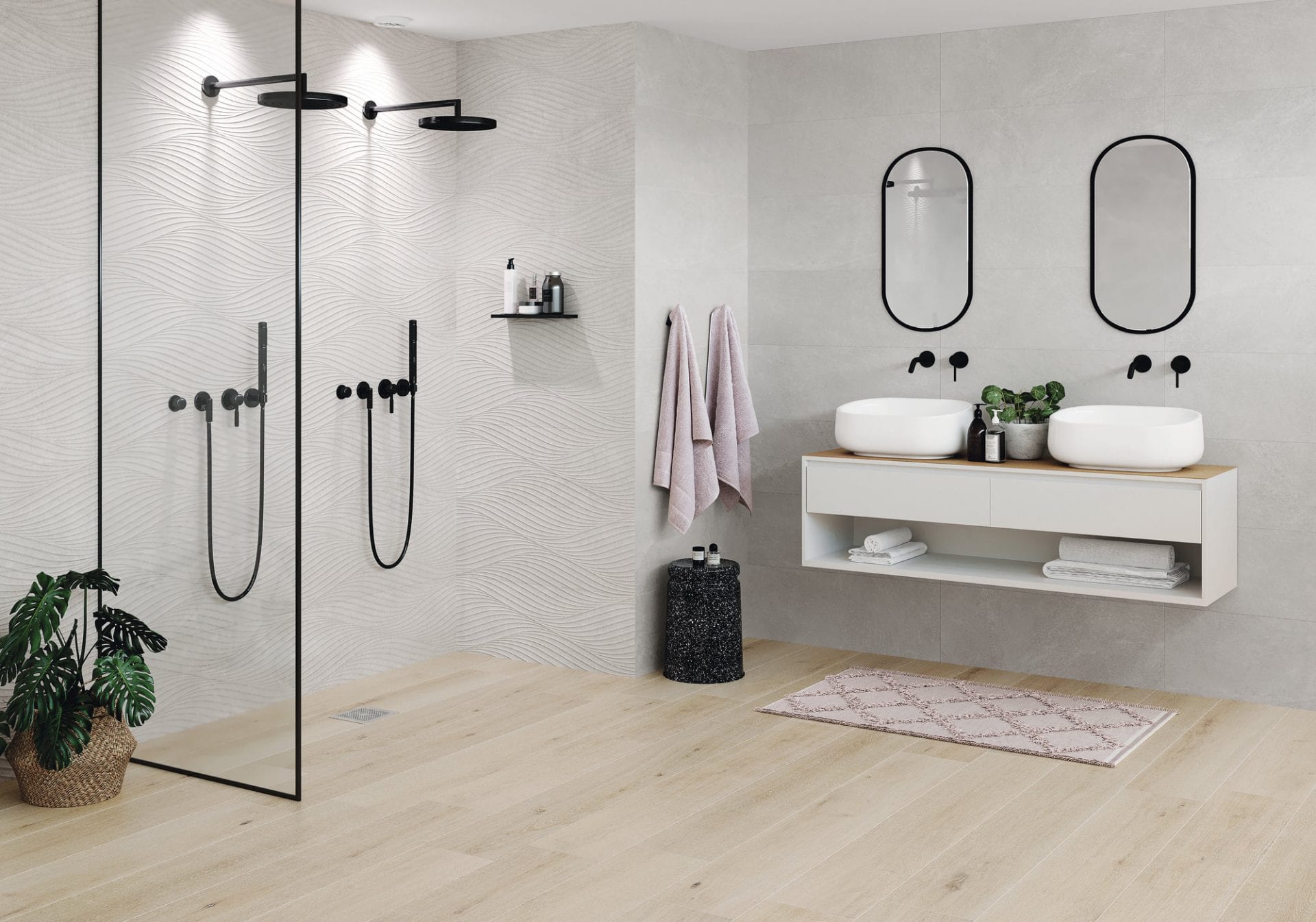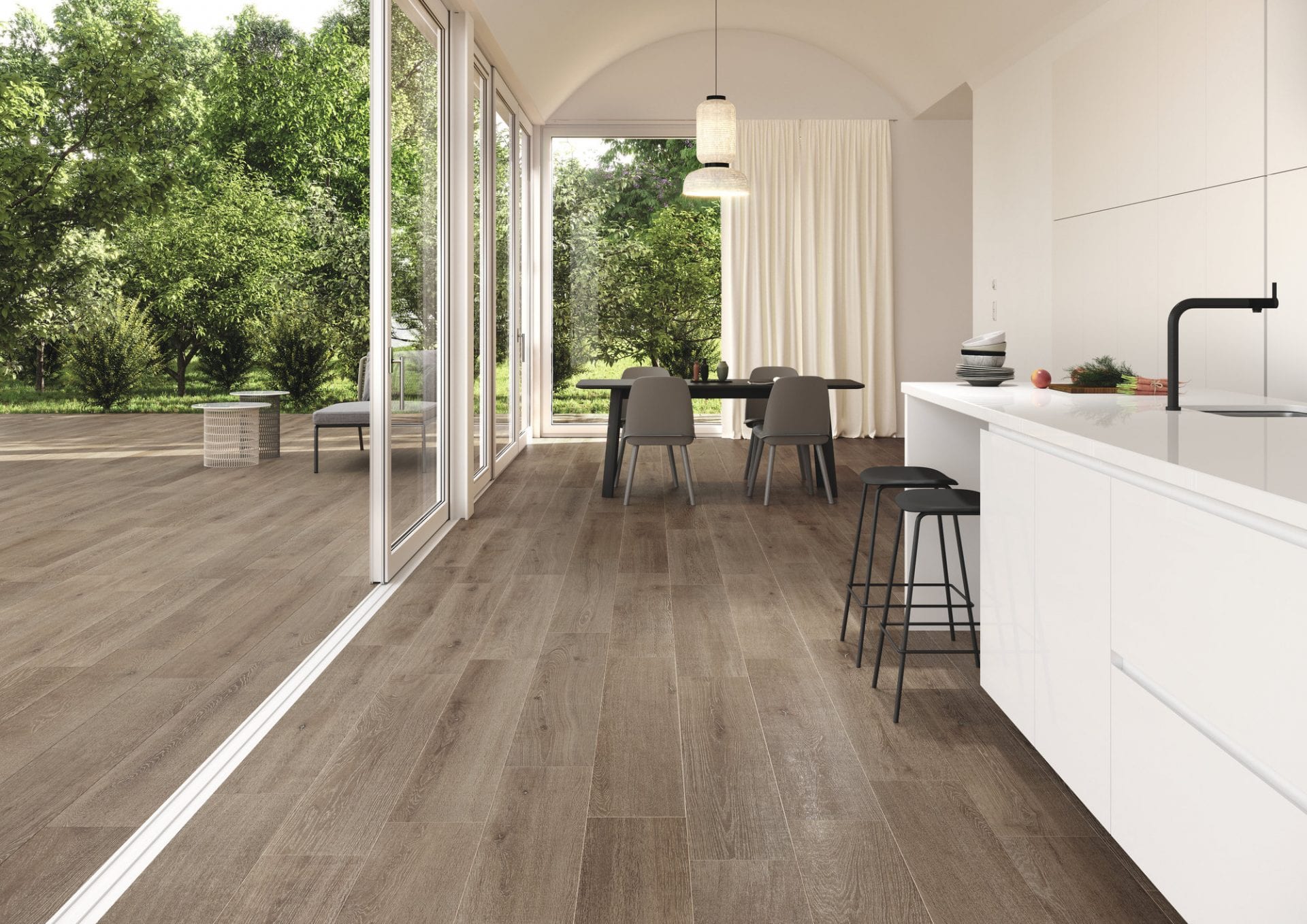 Madera porcelánica de formato de valor añadido que potencia las cualidades de su gráfica puesto que facilita la continuidad en el espacio. Presenta un suave relieve aserrado que acrecenta su acabado natural y calidez.