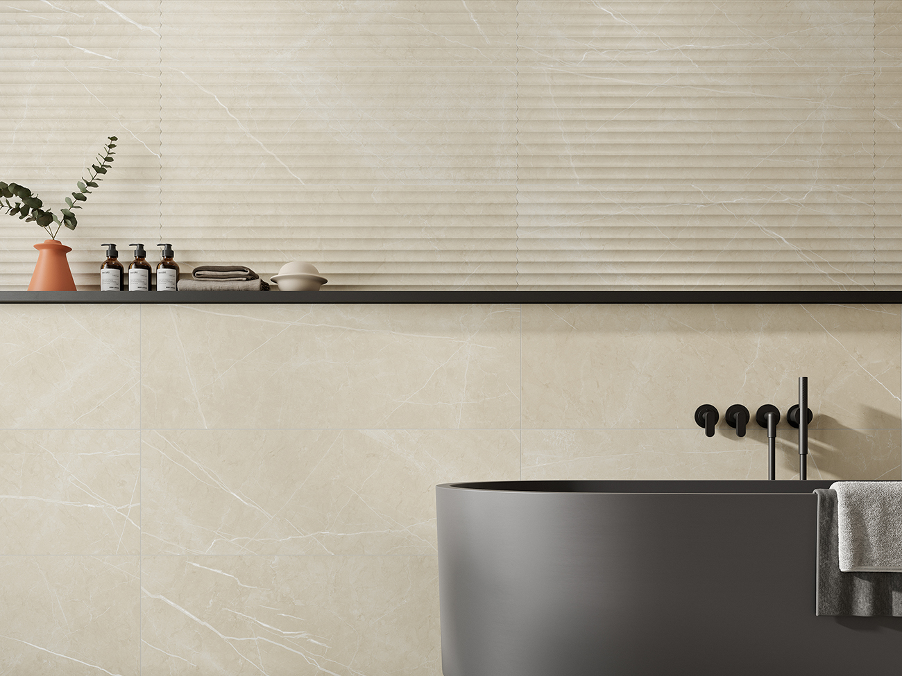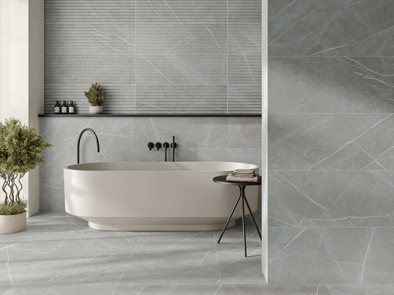 Los colores de la serie, Cream, Grey y White, ofrecen una paleta neutra que realza la pureza de los diseños, permitiendo combinar con diferentes estilos y creando ambientes cálidos y acogedores. La textura satinada de las piezas aporta una sensación de suavidad al tacto, mientras que las opciones pulidas proporcionan un acabado más brillante y sofisticado.